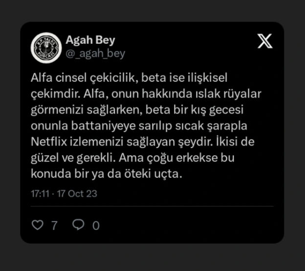 Bu camiada genellikle alfa kısmı daha çok anlatılır, oraya daha fazla özen gösterilir çünkü çoğu erkeğin sorun yaşadığı yer orasıdır. Ama sağlıklı ilişkiler için biraz Beta'da gerekir.